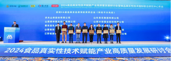 为表彰在食品真实性领域做出卓越示范引领和创新贡献的食品企业,进一步激励其在产品真实品质上的持续投入与创新研究,会议同期开展了“FA食品真实品质领航奖”和“食品真实性实践先锋奖”奖项评选活动,经评选,农夫山泉股份有限公司等10家企业获得“FA食品真实品质领航奖”,泸州老窖股份有限公司等7家企业获得“食品真实性实践先锋奖”。